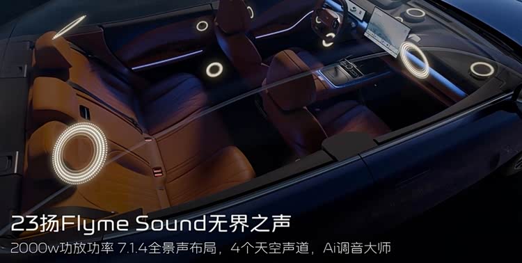 先看音响。新车搭载了同级唯一的23扬声器Flyme Sound音响系统,2000W的独立功放配合7.1.4全景声布局,4个天空声道的加持,让声音不再局限于水平方向,而是从四面八方包括上方传来。这样的配置,在传统燃油车上通常是豪华品牌旗舰车型才有。用户可以根据个人喜好选择4个声场位置(全车、主驾、后排、自由模式)、5种预设EQ模式(超低重音、动感流行、清澈人声、轻柔婉约、复古经典),或进行7频段自定义调节。录音棚、音乐厅、歌剧院、演唱会四大虚拟场馆模式,让车内随时可以变身为不同风格的听觉空间。