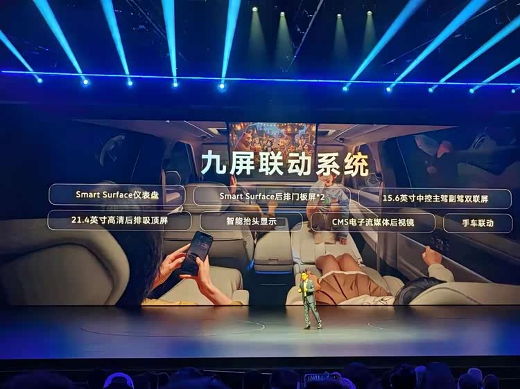 车内有 9 屏联动,即仪表屏 + 15.6 英寸主副驾双联屏 + 21.4 英寸后排吸顶屏 + 双后排门板屏 + AR-HUD + 流媒体后视镜 + 手车联动。
