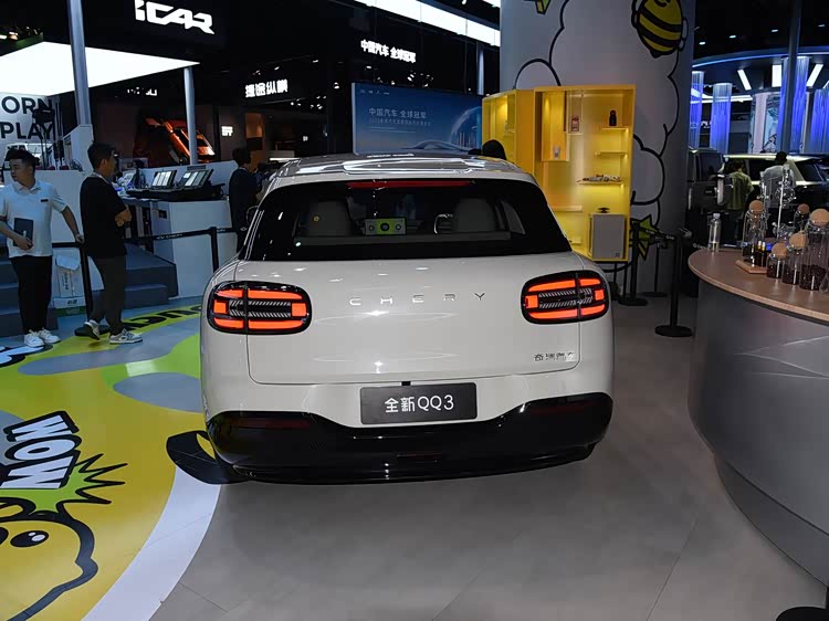 车身侧面,整体也采用了方正的设计,要比同级别的小型车更像SUV一些,车鼻更加突出,侧裙处也加入了粗壮的塑料装饰条,增强了跨界感,并有奇瑞车标进行点缀,独特的十字形轮毂罩堪称一大亮点,半隐藏式车门把手机械结构符合时下的要求。车身三围达到4195/1811/1569毫米,轴距为2700毫米,正像前文所述是史上最大的QQ车型。车尾部分,车顶有着大尺寸扰流板,尾箱线条同样方正,中央是QQ车标,左右两侧镶嵌有和大灯对应的尾灯组,依旧保持了个性的属性,让整车的风格形成统一。