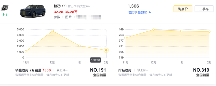 而至于年底推出的旗舰智己LS9,虽然在上市初期宣称订单火爆,但月销量便从12月的4768辆开始骤降,到今年2月起月销量仅1306辆,这种断崖式的下滑很难不让人怀疑其订单的含金量。