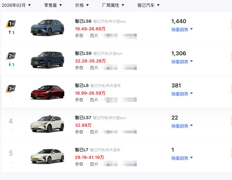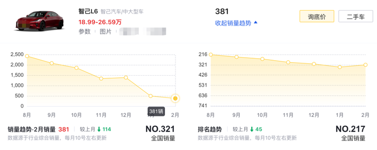 除了智己LS6,旗下其他车型几乎集体“哑火”。曾被寄予厚望的智己L6,作为对标小米SU7的战略级轿车,25年月销量从7月的高点3255辆一路下滑至12月的1387辆,呈现出加速下跌的趋势,到了今年2月销量更是跌至381辆。