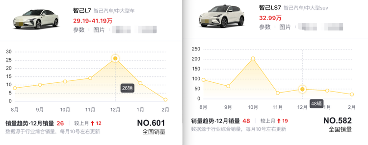 这两款定价高昂的车型在2025年的存在感几乎可以忽略不计,这也意味着智己在高端市场的品牌号召力已基本耗尽,只能在中低端市场靠智己LS6以价换量。