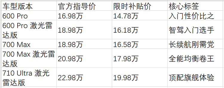 2、600 Pro激光雷达版(补贴后16.18万)→智驾刚需入门款