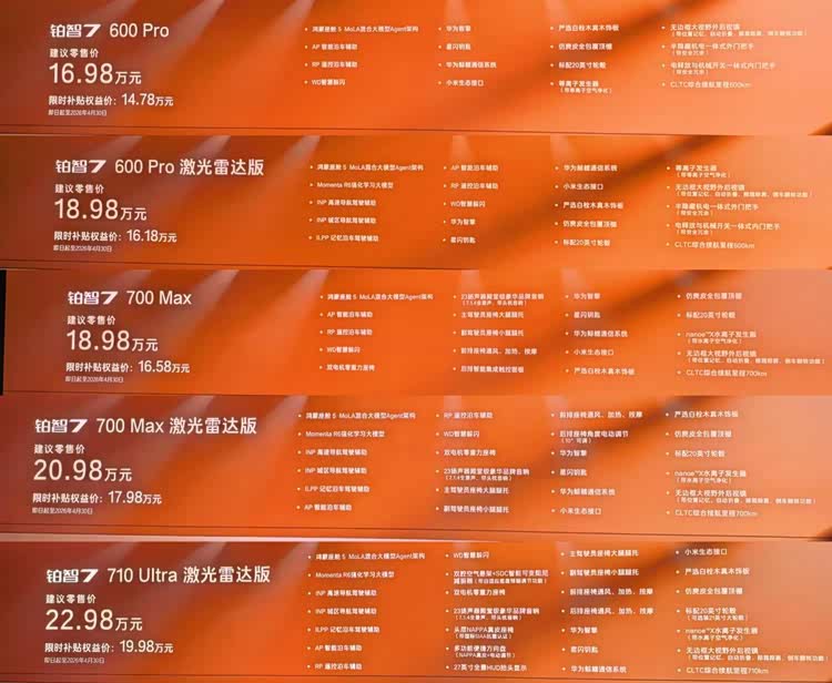 4、700 Max激光雷达版(补贴后17.98万)→全车最值得买,没有之一