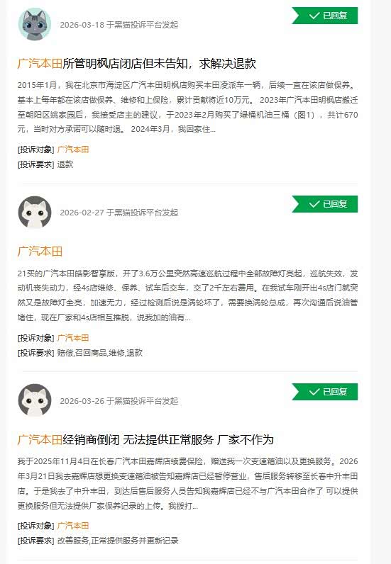 车友公社梳理发现,目前全国多地接连出现广汽本田授权经销商闭店、退网情况,车主投诉核心问题均为:在品牌授权4S店购买的厂家双保无忧套餐、保养套餐、预存维修款、未使用保养券等权益,因门店闭店无法兑现,而广汽本田方面多以“4S店独立行为”为由拒绝兜底处理。车友公社在黑猫投诉平台看到,此类投诉屡见不鲜。