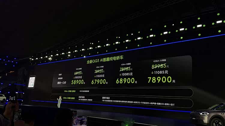 作为国民神车 QQ 的全新迭代,全新 QQ3 基于原生纯电平台打造,推出 310km、420km 两种续航共 4 款车型,官方限时上市价5.89 万 - 7.89 万元。相比预售阶段,新车最高降幅超 1.1 万元,以极具竞争力的价格,直接切入主流代步车价格带。