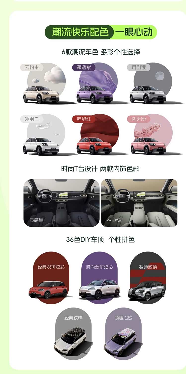 由红点设计双奖团队倾力打造,全新 QQ3 跳出传统代步车的廉价感。新车提供 6 种潮流车身配色,搭配 36 色 DIY 车顶,满足年轻用户个性化表达。同时采用豪车同级车漆工艺,实现 10 年不褪色,将精致感与耐用性完美融合。