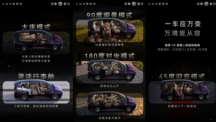 答答点评:智界V9由华为、奇瑞联合打造,是鸿蒙智行首款旗舰MPV,主打华为全栈智能、长续航、百变豪华空间、空气悬架,预计售价40-50万。智界V9的二排座椅可解锁多种模式,还能与三排座椅形成“移动大卧室”。与同级别的理想MEGA相比,智界V9的定价更有优势,增程动力减少了里程焦虑,补能方式也更灵活,但纯电续航较短,电动化平台方面不及理想MEGA,与理想MEGA的定位不同,属于错位竞争关系。