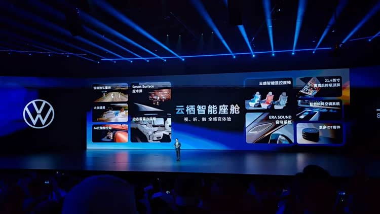 座舱方面,上汽大众ID. ERA 9X搭载了“云栖智能座舱”,车内拥有九块可以联动的屏幕,包括15.6英寸的中控主驾副驾双联屏和21.4英寸高清后排吸顶屏。