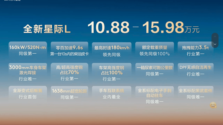 从发布会公开的信息可知,全新星际L提供柴油、纯电双动力选择。柴油版搭载上汽πPlus 2.5T发动机,最大功率165kW、峰值扭矩520Nm,0-100km/h加速9.6秒,同级最快,百公里油耗仅7.9L,配备行业唯一DPF无感自洁技术;纯电版搭载88kWh电池,CLTC续航里程为515公里,百公里电耗仅17度,支持外放电与多重电池防护;新车配备同级唯一三把锁与陡坡缓降系统,额定载重较同级竞品翻倍,且最大拖拽超3.5吨,同级最大。星桥架构的高强度钢和超高强度钢占比超70%,搭配行业首创全渐变式后板簧与3000mm一体式激光焊接,车顶盖一体成型,也是行业唯一没有拼焊和涂胶的皮卡车。