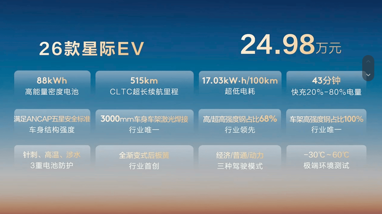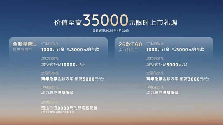 作为上汽大通2026年在皮卡市场的扛鼎之作,全新星际L以同级领先的承载能力、动力性能和乘驾体验完成了产品力的全面跃升。其中,26款星际EV售价24.98万元,全新星际L售价10.88万~15.98万元,26款T60售价7.98万~10.18万元。即日起至4月30日,下订用户更能享多重上市礼遇,综合权益至高3.5万元,全方位降低购车与用车成本。
