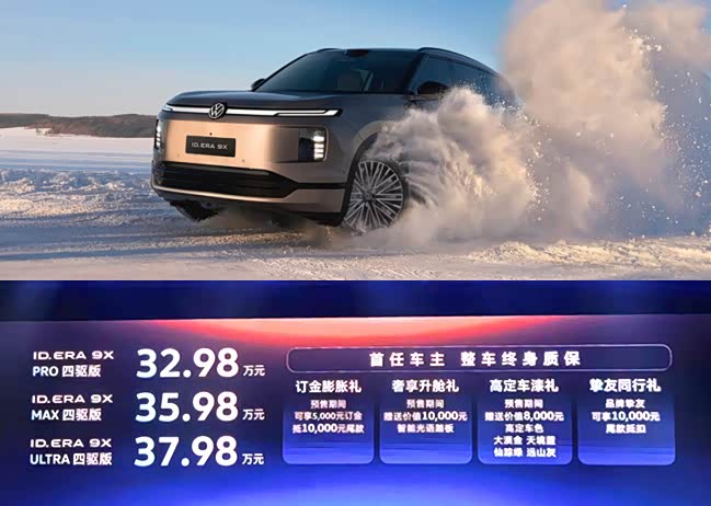 这年头,可不是随便什么车起步就敢上30万的。3月30日,上汽大众大6座增程SUV——ID. ERA 9X在深圳宣布预售,推出Pro、Max、Ultra三款四驱,预售价分别为32.98万元、35.98万元和37.98万元。这款车有多强呢?大众方面为其加冕“增程新王”,并开玩笑说“欢迎友商切磋增程技术”。