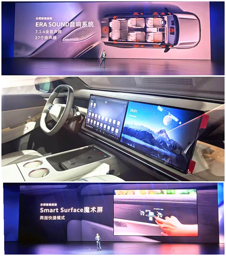 但我们等会再讲增程,先来说说ID. ERA 9X云栖智舱的“德系细节”。三代同堂的6座车,打开车门车身悬架竟然会“蹲下来”,主动降低高度以便老人孩子上下和拿取行李。动态零重力座椅要求细到真皮的等级和鞣制具体工艺,除了通风加热按摩等基操,竟然还带烘干衣服的功能,靠背和座垫甚至能够分开设置。空调要求有凉意无风感,后排的小孩子用语言和手势就能交互操作车窗升降。智能WHUD可自动追踪驾驶者眼球位置并调整投影。全车27 个扬声器,有4个藏在头枕里。车内九屏联动,包括前排15.6英寸中控双联屏,后排21.4英寸吸顶屏以及3块Smart Surface魔术屏等。其中Smart Surface魔术屏隐匿于后排车门木纹内饰里,需用时自动唤醒,特别魔幻。