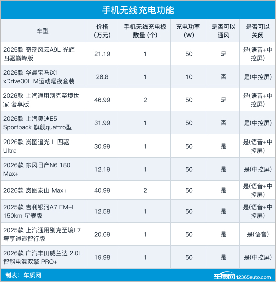 通过10款车型手机无线充电功能对比可以发现,上汽通用别克至境世家和岚图泰山是本次对比中,唯二配备2个50W无线充电板的车型,且均支持通风和关闭功能,整体表现可圈可点。华晨宝马iX1和上汽奥迪E5 Sportback的手机无线充电板均不具备通风功能,尚存在提升空间。奇瑞风云A9L光辉、上汽通用别克至境世家、岚图追光L、岚图泰山和吉利银河A7 EM-i的手机无线充电板均支持两种关闭方式,实用性表现更为出色。