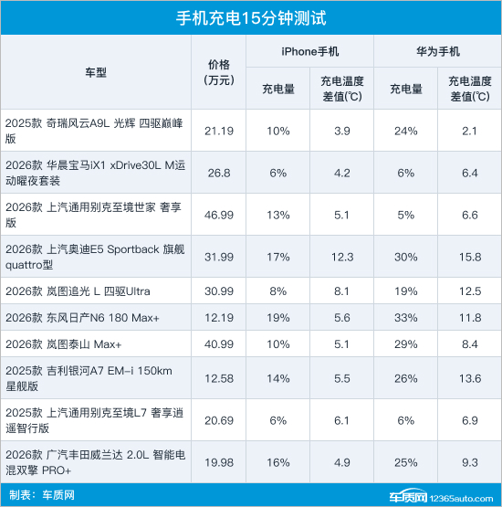 此次参与测试对比的10款车型中,广汽丰田威兰达的综合表现领先,不仅对于iPhone和华为手机的充电效率都比较高,而且手机发热量也控制得在合理范围内。除此之外,东风日产N6、奇瑞风云A9L光辉和岚图泰山的测试成绩也能够令人满意。上汽奥迪E5 Sportback对于两款手机的充电效率都很高,只可惜温差控制表现不好。与之相反的是华晨宝马iX1和上汽通用别克至境L7,这两款车型都是温差控制较为出色,但是对于两款手机的充电效率偏低。