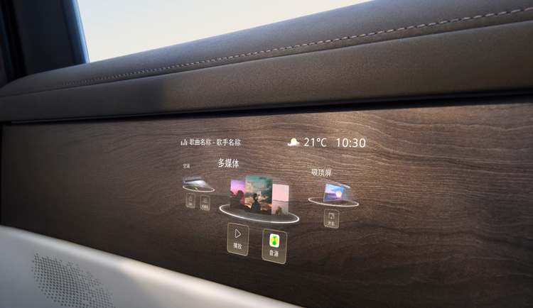 座舱内配备九屏联动系统,包括前排15.6英寸中控双联屏、后排21.4英寸吸顶屏及3块Smart Surface魔术屏,将整车的科技感包装得比较到位。其中,这一Smart Surface魔术屏,算是一大亮点,在不使用时它能与饰板完全融合,但你需要使用时它又能显现出来,就像“全息影像”一样,看起来就比较拉风。