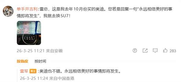 安徽奥迪车主在雷军微博留言,放话只要得到「永远相信美好事情即将发生」的回复,就会换购 小米SU7(参数|询价)。【P1】