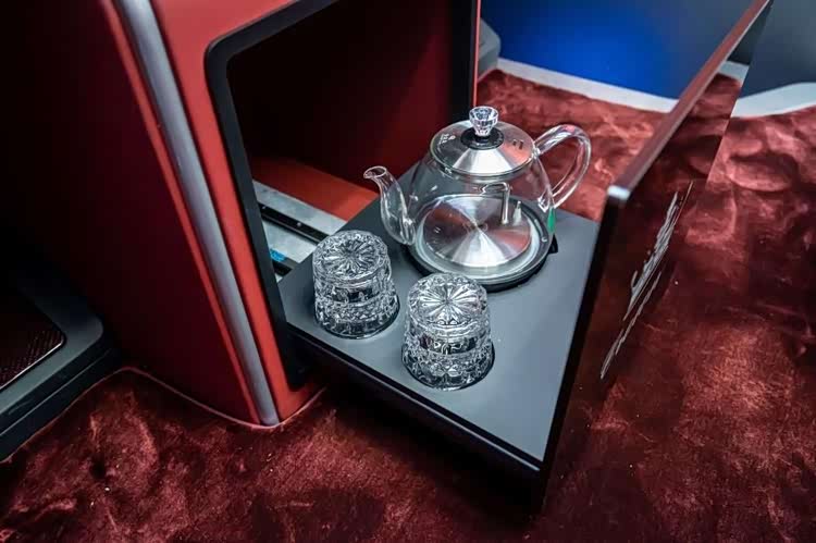 中排座椅之间隐藏电动茶台办公桌,展开后尺寸达 1.1 米 ×0.5 米,茶台区域配备嵌入式烧水壶与功夫茶盘,5 分钟烧开饮用水,水流细腻不飞溅;办公区域承重 15kg,可放置笔记本电脑、文件,边缘硅胶防滑条应对颠簸路况。