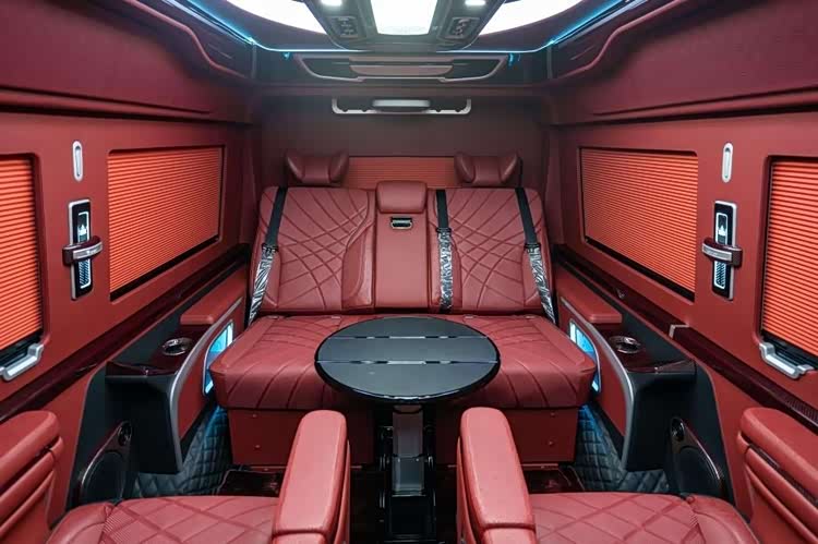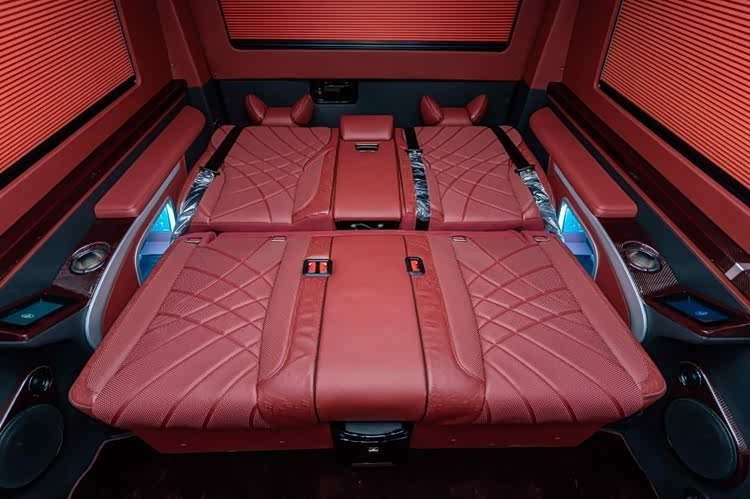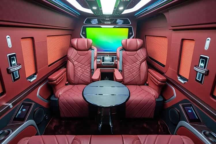 方形窗户采用双层隔音玻璃,采光面积比普通车窗提升 20%,配合黑红内饰不显压抑;红色碳纤维装饰贯穿门板、桌板边缘,与地板材质呼应,方向盘与扶手箱点缀同款装饰,触感冰凉细腻,彻底告别传统商务车的 “厚重感”,尽显个性化定制水准。