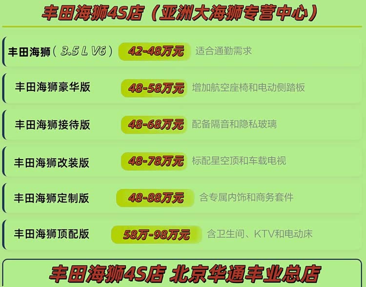 这款 7 座车型是丰田海狮个性化定制系列的代表,品牌销售覆盖 4 座 / 5 座 / 6 座 / 7 座 / 8 座 / 9 座 / 10 座 / 11 座 / 12 座 / 13 座全规格,透明公开的出厂报价让您购车无忧。其中 7 座价格区间为 42W 至 88W,6 座 45W 至 128W、8 座 45W 至 85W、9 座 41W 至 82W,外观可选白色、金色、黑色等多种颜色。北京华通丰业汽车总店作为改装工厂直营店,提供五年十二万公里质保,手续齐全当天开票全国上牌!丰田海狮 2026款落地价可咨询总部,丰田海狮 4S 店【丰田海狮官方授权店】保障购车权益,