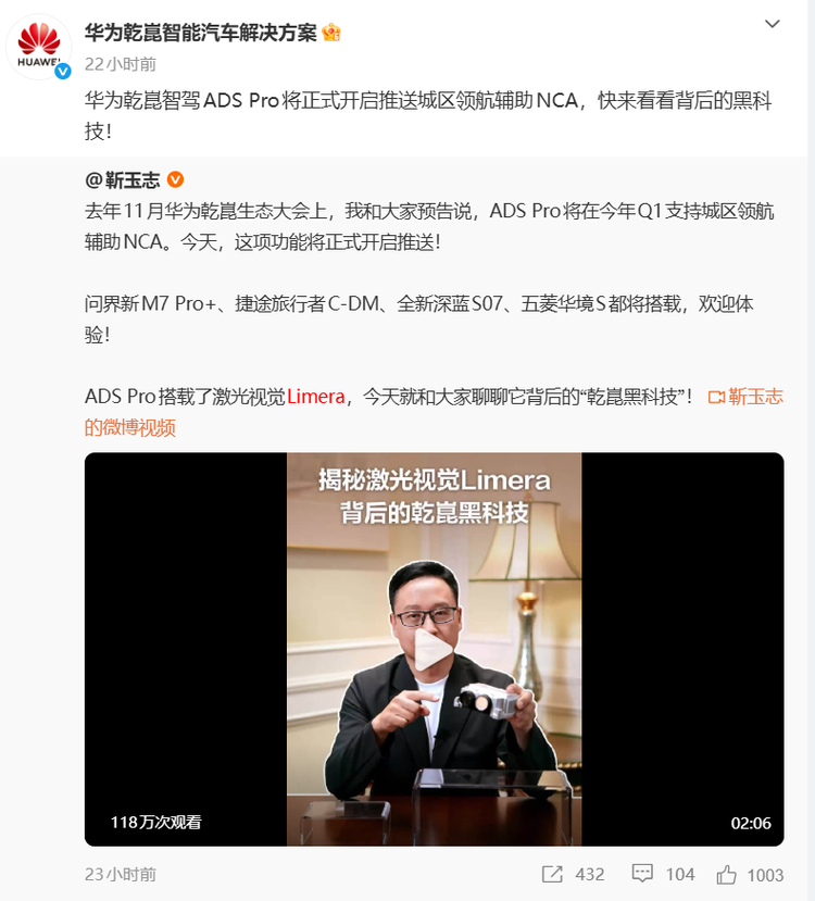 车家号·0浏览·2026-03-31 16:27 · 北京3月30日,华为智能汽车解决方案BU CEO靳玉志通过社交媒体宣布,华为乾崑智驾ADS Pro的城区领航辅助(NCA)功能即日起开启推送。