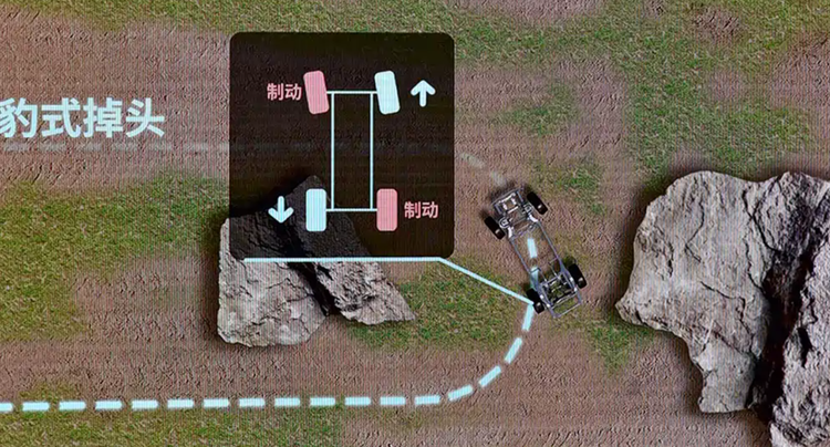 DMO的“超能力”还体现在首搭的“豹式调头”功能。通过电控对左右车轮施加反向作用力,可在非铺装路面缩小转弯半径至3.4米。