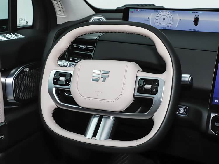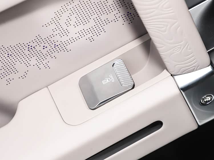 科技感的体现则集中在屏幕之上。一块35.4英寸的贯穿式屏幕整合了仪表与副驾娱乐信息,前方还有一块15.6英寸的悬浮式中控大屏。它的UI界面支持越野主题定制,能将关键信息以更直观的方式呈现。平底式真皮方向盘上绣有顶火联名标识,功能按键布局清晰。副仪表台区域的设计颇具巧思,饰板上的等高线地形花纹呼应了越野主题,两侧皮质包裹的实体拉手,在车辆大幅度摆动时能为乘员提供稳定的抓扶点。