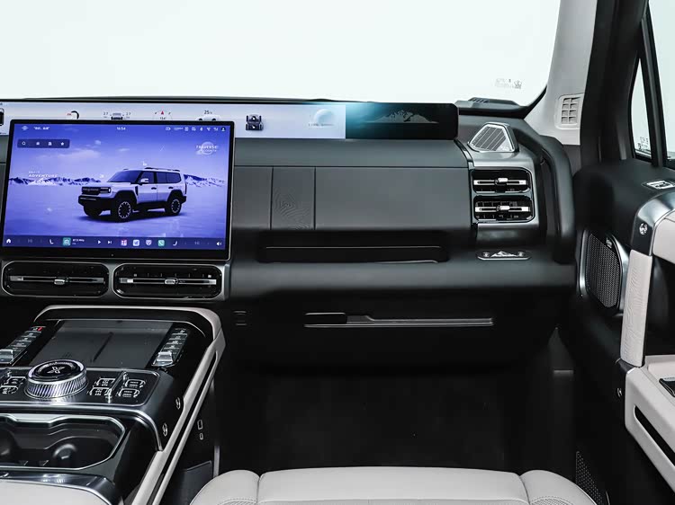 进入车内,你会发现它没有为了追求所谓的科技感而牺牲实用性。中控台采用横向分层布局,大量关乎驾驶与越野的物理按键和旋钮被保留下来,例如驾驶模式选择、差速锁控制、空调调节等。在非铺装路面颠簸行驶时,这种实体按键的盲操可靠性与便利性,是触控屏难以替代的。