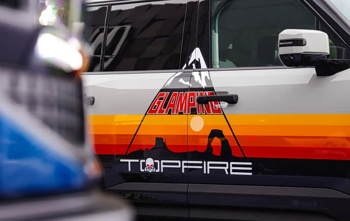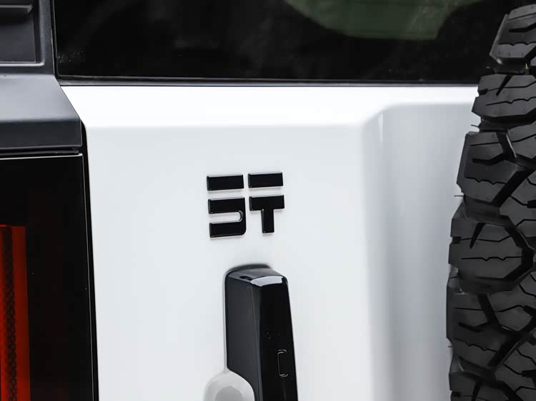 车侧线条平直硬朗,一道清晰的腰线贯穿头尾,最引人注目的是那套20英寸的锻造越野轮圈,搭配百路驰KO3全地形轮胎。这套组合不仅看起来强壮,在实际抗损伤和湿地抓地表现上也有所侧重。专属的越野侧踏和顶火共创拉花,则表明了它不一般的身份。车尾部分,外挂式全尺寸备胎和全新的后包围是标准配置,这种原厂状态下的“完全体”,省去了用户后续改装的备案手续。加厚的钢制竞技后防护杠能在复杂地形下提供保护,底部预留的原厂高强度拖车点,则为野外救援或自我脱困做好了准备。