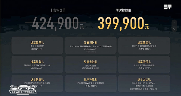 今天, 纵横G700(参数|询价)家族增添了一位风格鲜明的新成员——顶火鸣镝版。这款车并非简单的配置堆砌,它源自纵横品牌与顶火之间的深度共创。新车在纵横G700固有的硬派架构之上,进行了一系列指向性明确的强化,目的是在复杂的越野环境与日常公路驾驶之间,找到一个更稳固的平衡点。它的官方指导价格定在42.49万元,而在特定时间内,可以39.99万元的权益价入手。