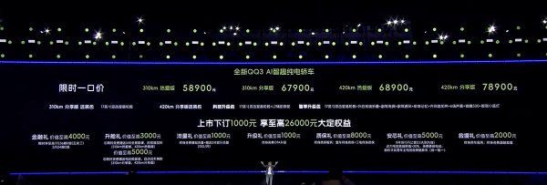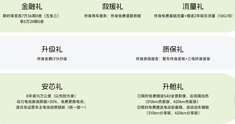关于新车的权益,目前下订1000元,享至高26000元大定权益,包括金融礼、升舱礼、流量礼、升级礼、质保礼、安芯礼和救援礼。此外,310km版本分享版选装17英寸双色轮圈、420km 分享版提供科技升级包和智享升级包。