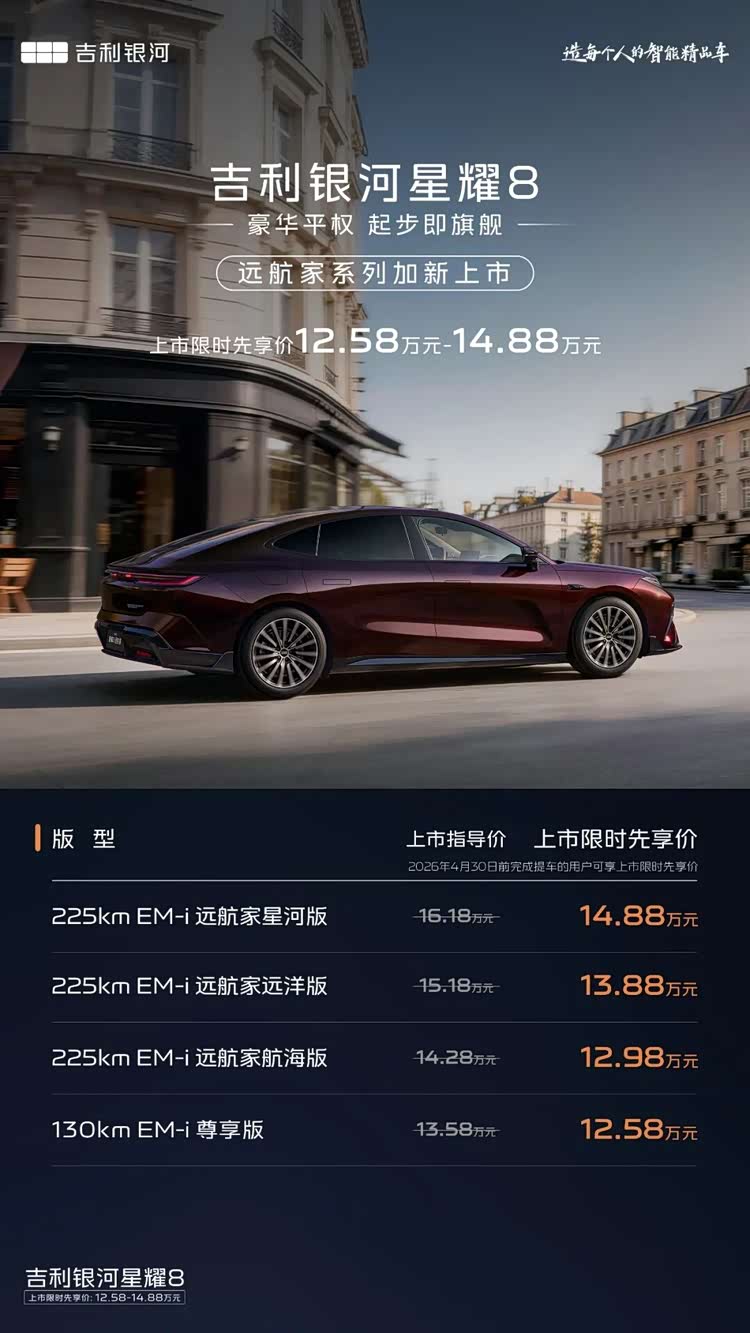 在原有130km EM-i尊享版基础上,吉利银河星耀8远航家系列新增225km EM-i远航家航海版、225km EM-i远航家远洋版、225km EM-i远航家星河版三个续航225km版型,上市限时先享价12.98~14.88万元。即日起,下定即享9重丰厚购车权益,超高价值,诚意拉满。