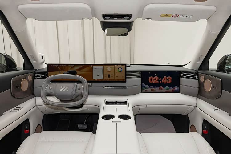 内饰部分,中控台有着不错的设计感,仪表盘和中控屏为悬浮式的连屏造型,副驾一侧还使用了卧屏设计,两幅式的方向盘盘幅使用了不规则的轮廓,有着不错的运动感。