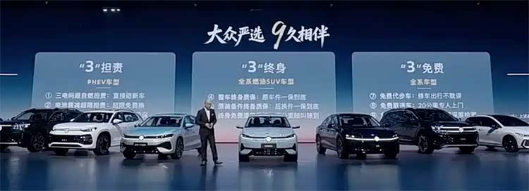 发布会真正的战略重头戏,是“大众严选9久相伴”服务承诺的发布——三担责:PHEV车型三电系统自燃可免费置换、电池衰减超标可免费换、核心部件质保延至8年或16万公里;三终身——燃油SUV首任车主享整车终身质保、终身免费救援、原厂配件终身质保;三免费——维修超5天提供代步车、20公里内免费取送车、保养享29项免费检查。