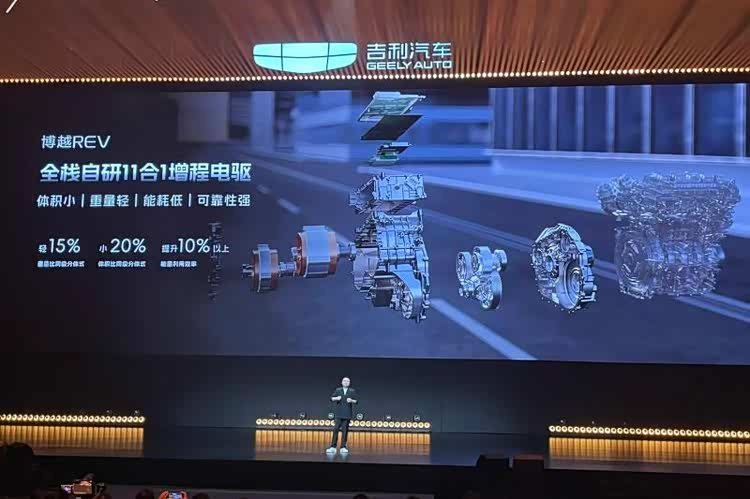 动力与驾控是博越REV的核心竞争力所在。新车采用超级铂金增程技术,行业首发的11合1增程电驱系统将增程器、发电机、驱动电机、减速器等11个核心部件高度集成,结构紧凑、轻量化的同时进一步降低了能耗。