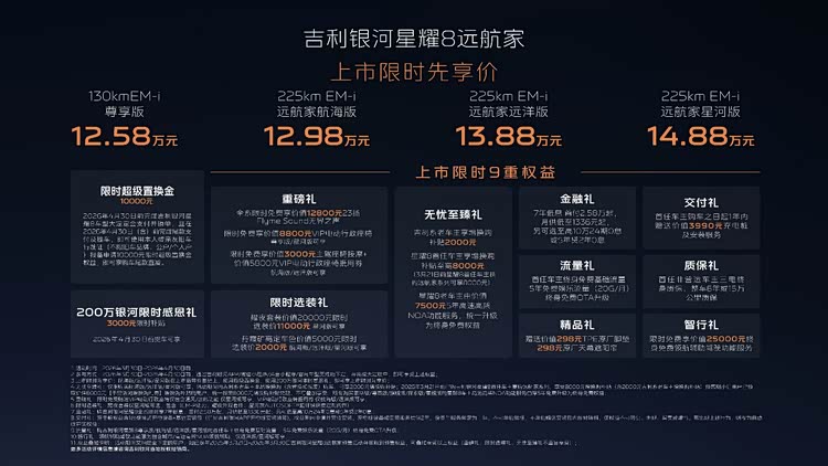 3月30日,吉利 银河星耀8(参数|询价)远航家系列加新上市。在原有130km EM-i尊享版基础上,新增三个225km纯电续航版本,上市限时先享价12.98万元至14.88万元。新车携手演员黄宗泽,以“阿sir的新车”为场景化主题,突出产品在颜值、科技与续航等方面的综合表现。