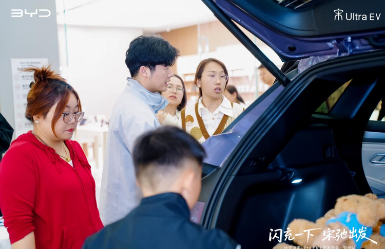在上市发布之后,核心媒体代表上台分享证言,从实际感受出发,肯定了宋Ultra EV在闪充速度、电池安全、智能驾驶及空间表现等方面的全面越级实力。随后,领导、嘉宾与媒体共同登台,与新车合影留念,定格这一重要时刻。活动进入自由品鉴环节。嘉宾们近距离感受宋Ultra EV的设计细节与智能座舱,销售团队围绕车型亮点与购车政策进行深入讲解,现场气氛热烈。