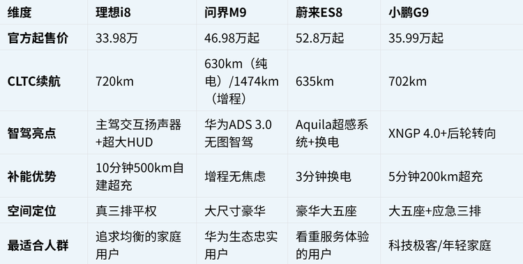 30万级的智能6座SUV市场,已从"有没有"进入"好不好"的阶段。理想i8以33.98万的价格,提供了720km续航、真三排平权、10分钟超充和顶级的家庭舒适配置,重新定义了"价值标杆"。而问界M9、 蔚来ES8(参数|询价)、小鹏G9则在各自的技术路线上提供了差异化选择。