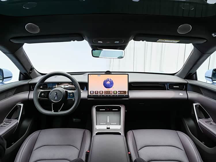 内饰方面,该车配备了长条状的液晶仪表盘和大尺寸中控屏幕,内饰设计比较简洁,前排地台上有两块手机无线充电面板,并无换挡机构。该车的换挡机构位于方向盘右侧底部,采用了电子怀挡,不会侵占前排地台的空间。