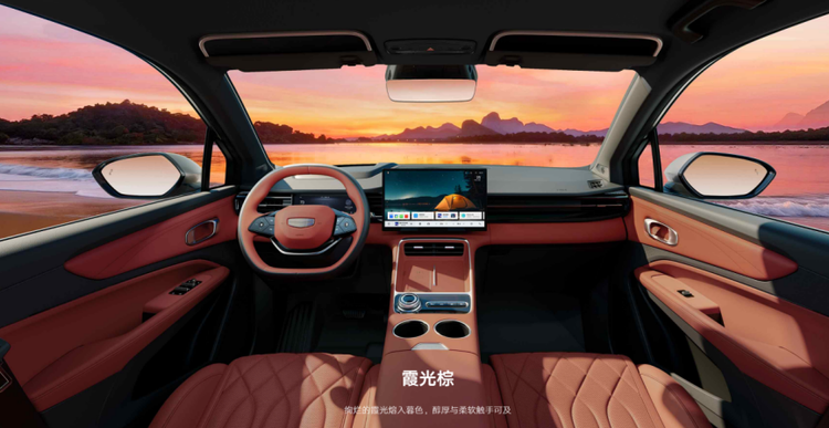 座舱内,14.6英寸中控屏分辨率为1080P,亮度800NIT,搭配15英寸W-HUD,投影距离2.5米,支持红绿灯读秒提醒。16扬声器Flyme Sound音响系统,12通道1000W独立数字功放,7.1立体环绕声,主驾内置2个头枕音响,支持共享、驾享、私享、智能四种模式。128色律动氛围灯可根据用车场景智能律动,并联动来车预警、安全带未系、车门未关等提醒。外观提供海岩灰、深海蓝、浪花白、水波蓝四种颜色;内饰有曙光橙、霞光棕、星夜灰三种选择。从外到内,博越REV的设计语言保持了高度统一——海潮是主线,实用是底色。