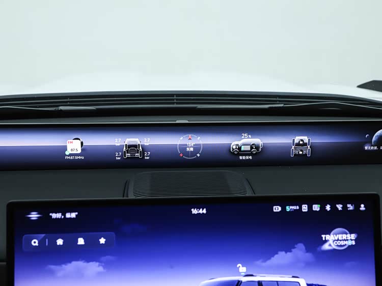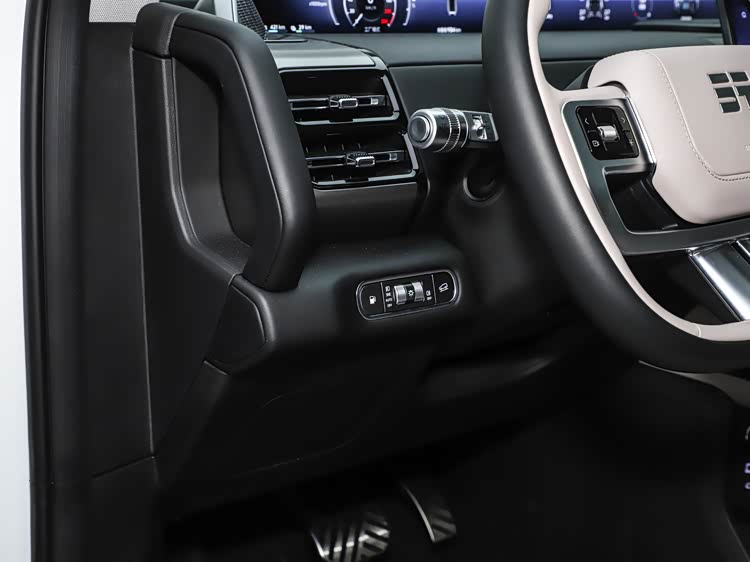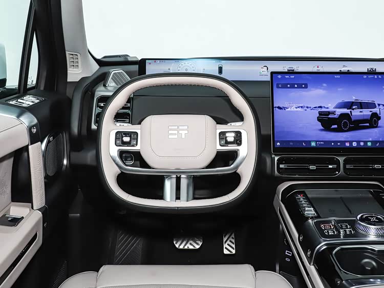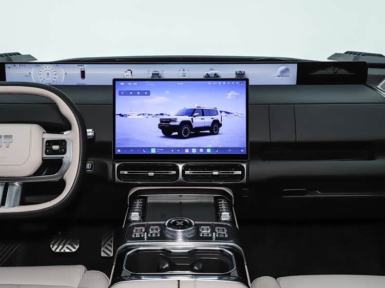 内饰部分采用横向分层布局,中控台结构相对规整,核心操作区域保留大量实体按键与旋钮,包括驾驶模式切换、差速锁控制以及空调调节等功能。这种设计在颠簸路面中更有利于盲操作,降低误触风险。显示系统方面,车辆配备35.4英寸贯穿式屏幕组合,将仪表与副驾娱乐整合,同时提供15.6英寸中控触控屏,界面支持越野主题显示,可实时反馈车辆姿态与路况信息。