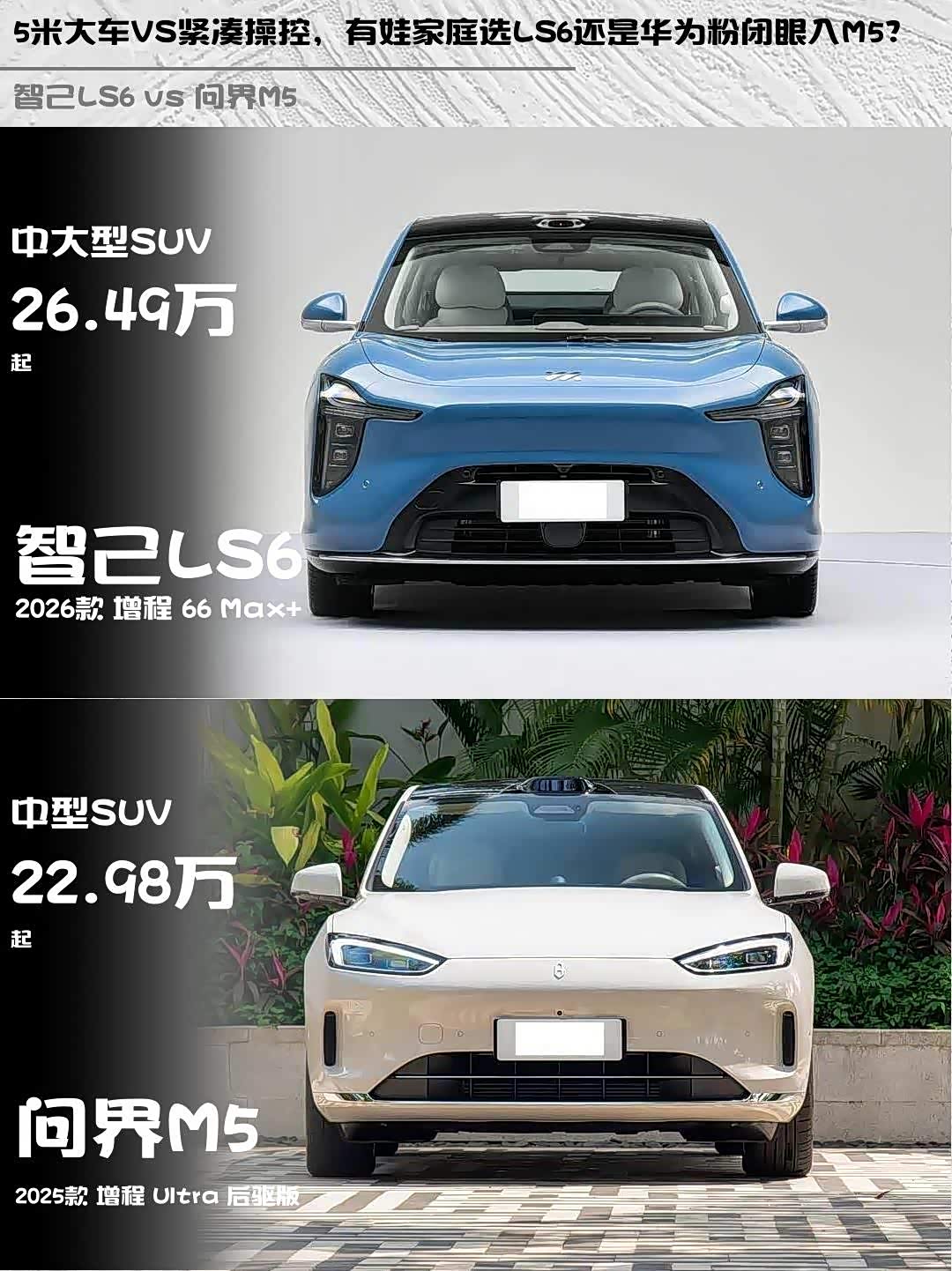 智己LS6 26.49万,五年质保+终身免费智驾;问界M5 22.98万,四年质保,华为生态加分。