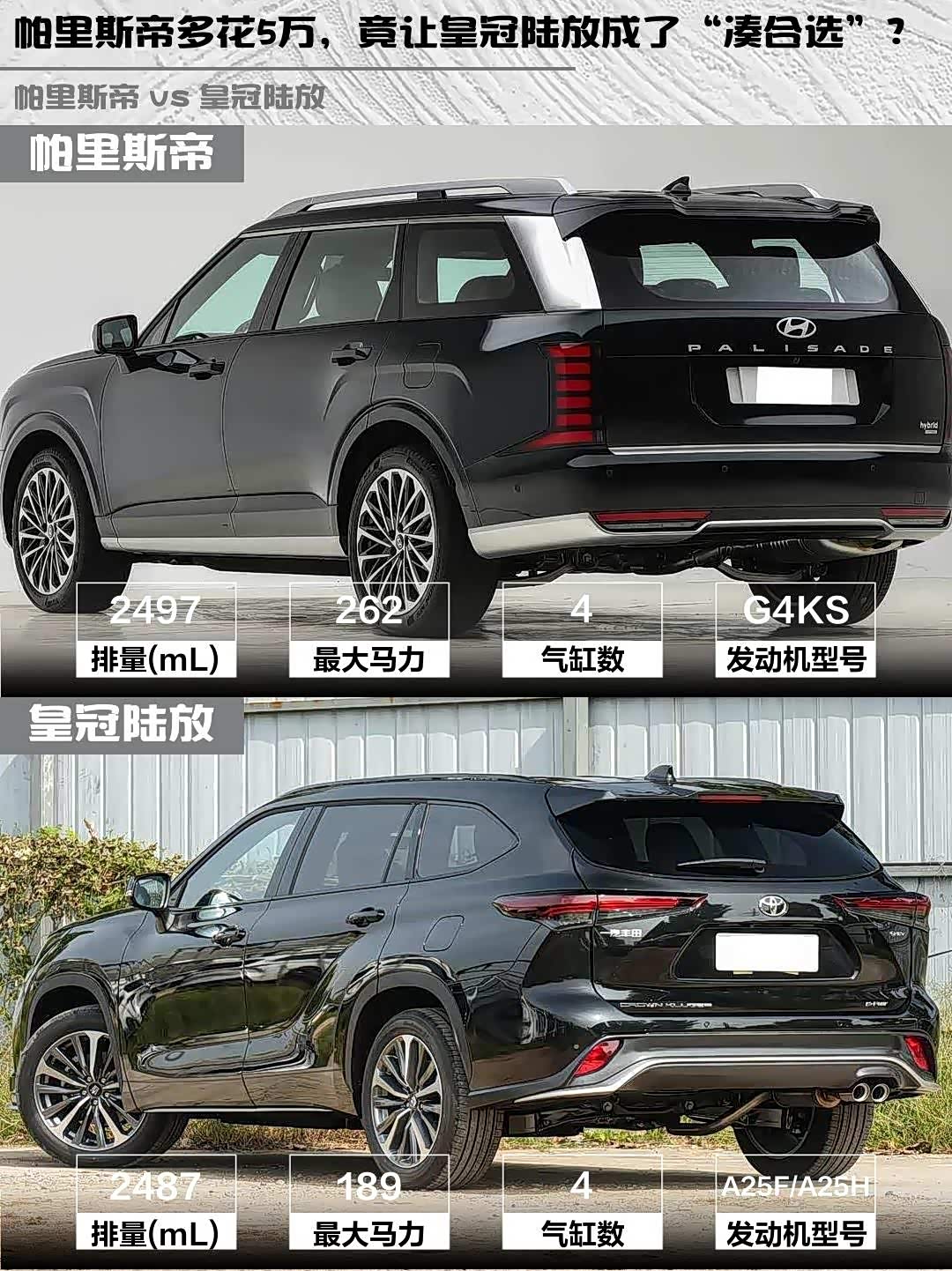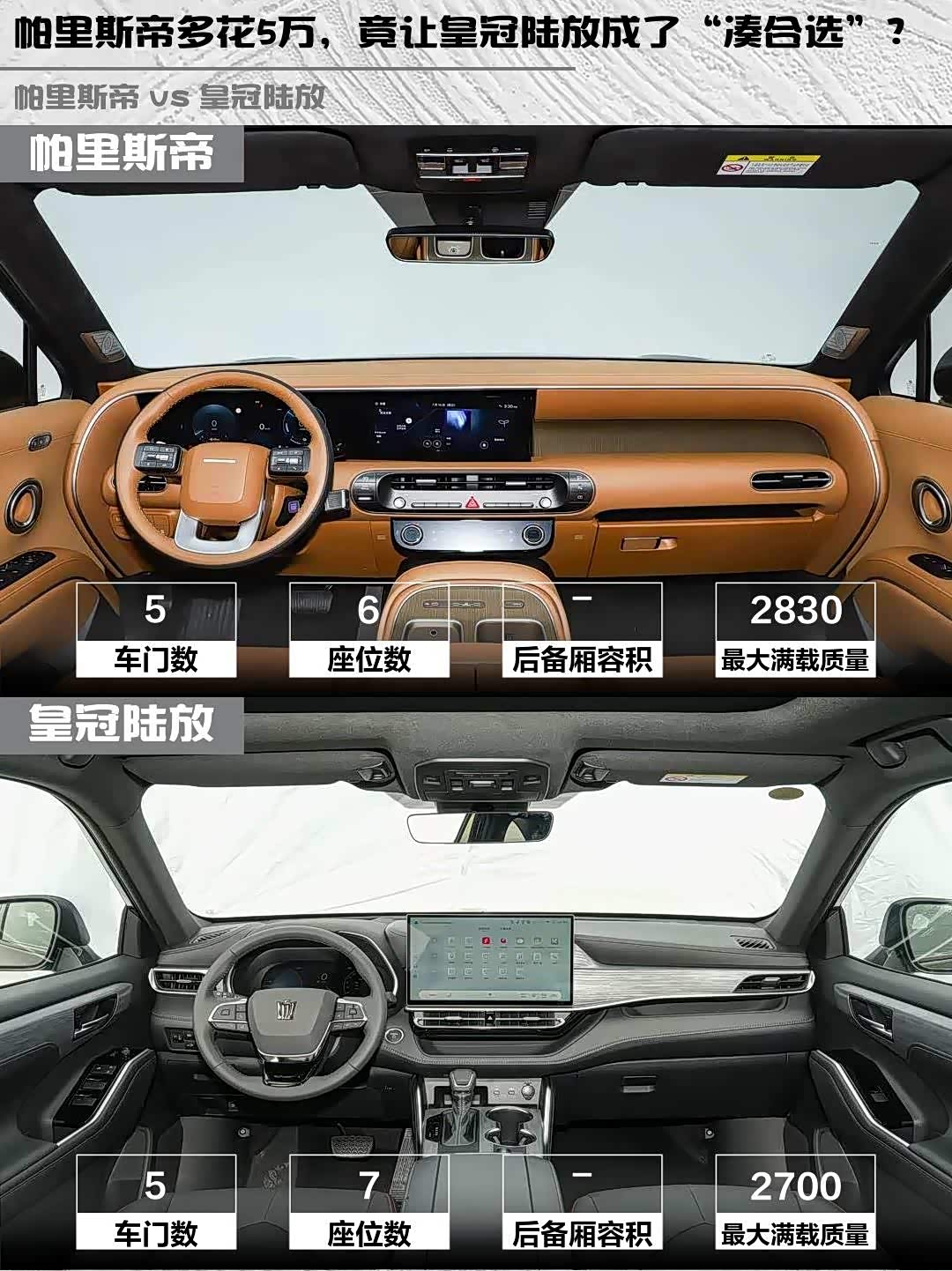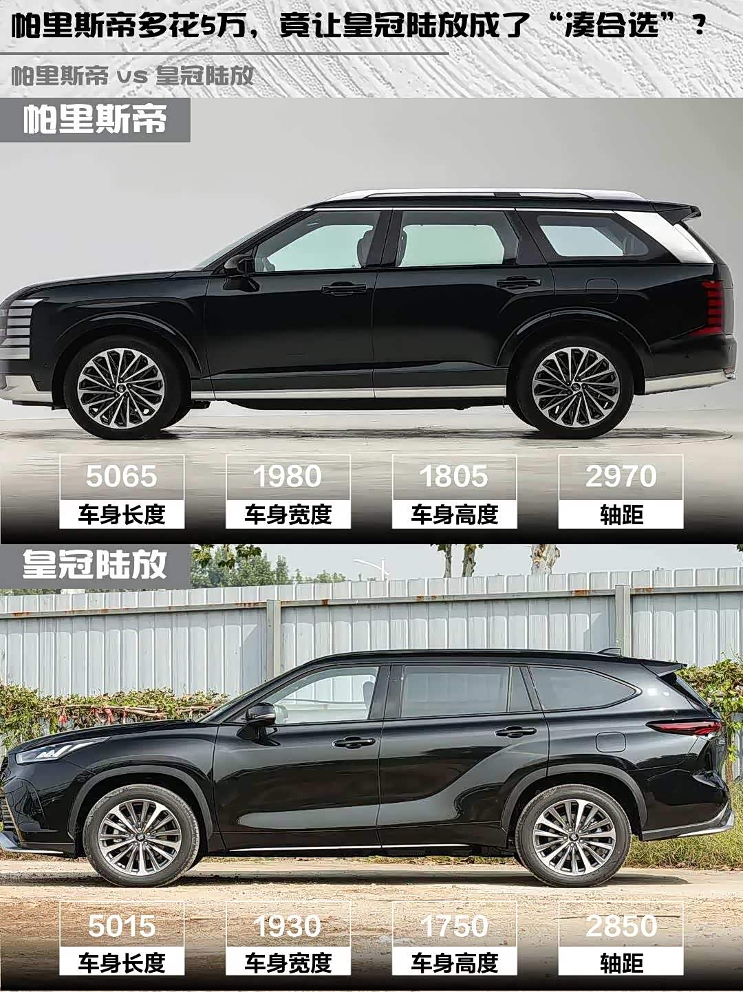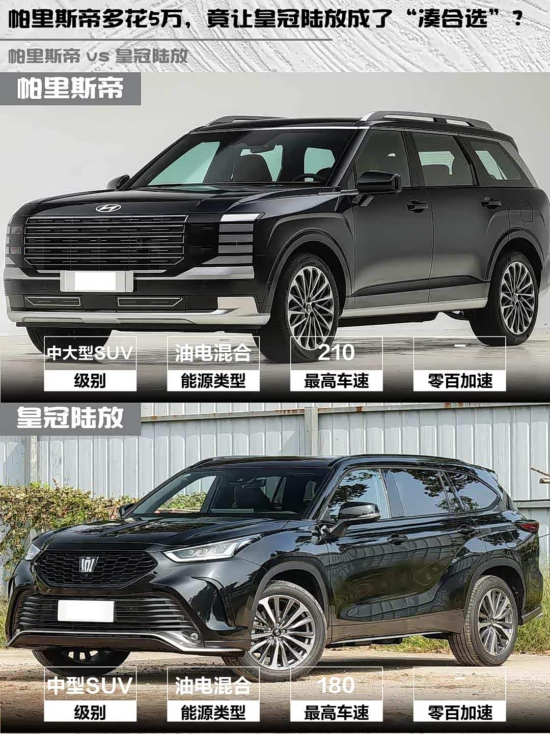 帕里斯帝指导价36.18万,皇冠陆放30.98万。虽然差价5万+,但帕里斯帝多了座椅按摩、更大轮毂、更长的整车质保。如果预算够,建议直接上帕里斯帝,毕竟“买大不买小”是SUV真理!当然皇冠陆放的终端优惠可能更大,具体看当地政策。