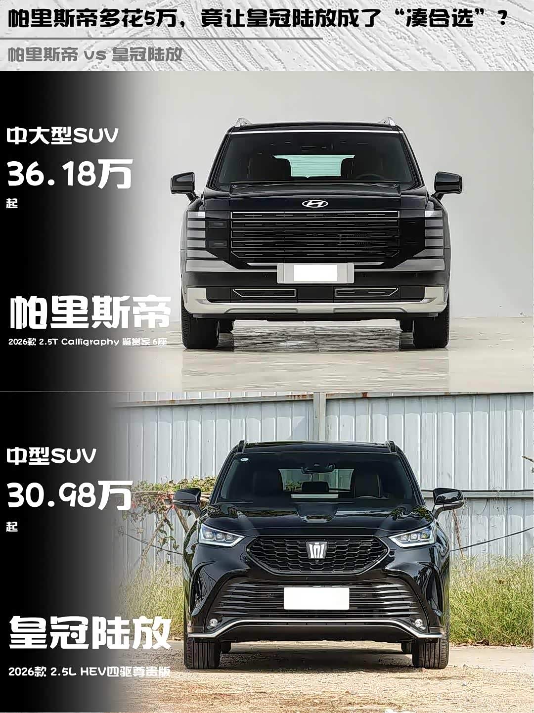 最近在选车的小伙伴看过来!今天给大家深度对比两款热门中大型SUV—— 帕里斯帝(参数|询价) 2026款 2.5T Calligraphy 鉴赏家 6座和皇冠陆放 2026款 2.5L HEV四驱尊贵版,看完这篇你就知道哪款更适合你!🔥