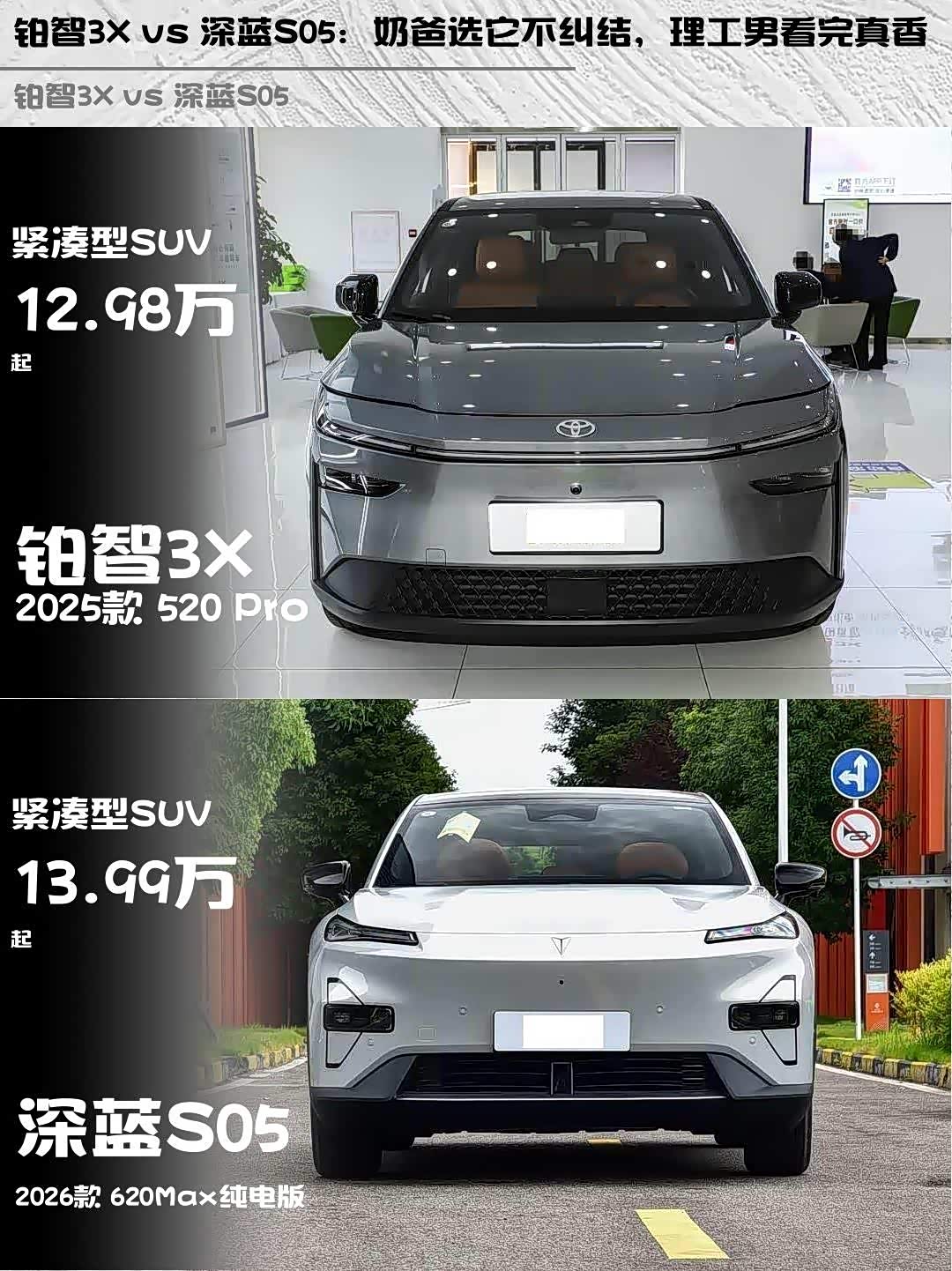 铂智3X 12.98万的价格真香,三年10万公里质保+丰田口碑,后期省心。深蓝S05 13.99万,多了电动尾门等配置,三年12万公里质保更长,但品牌保值率可能不如丰田💸