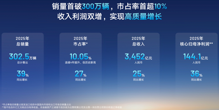 2025年吉利汽车总收入3452亿元,同比增长25%,创历史新高;毛利总额573亿元,毛利率稳定在16.6%;核心归母净利润144.1亿元,同比大增36%,增速跑赢营收。