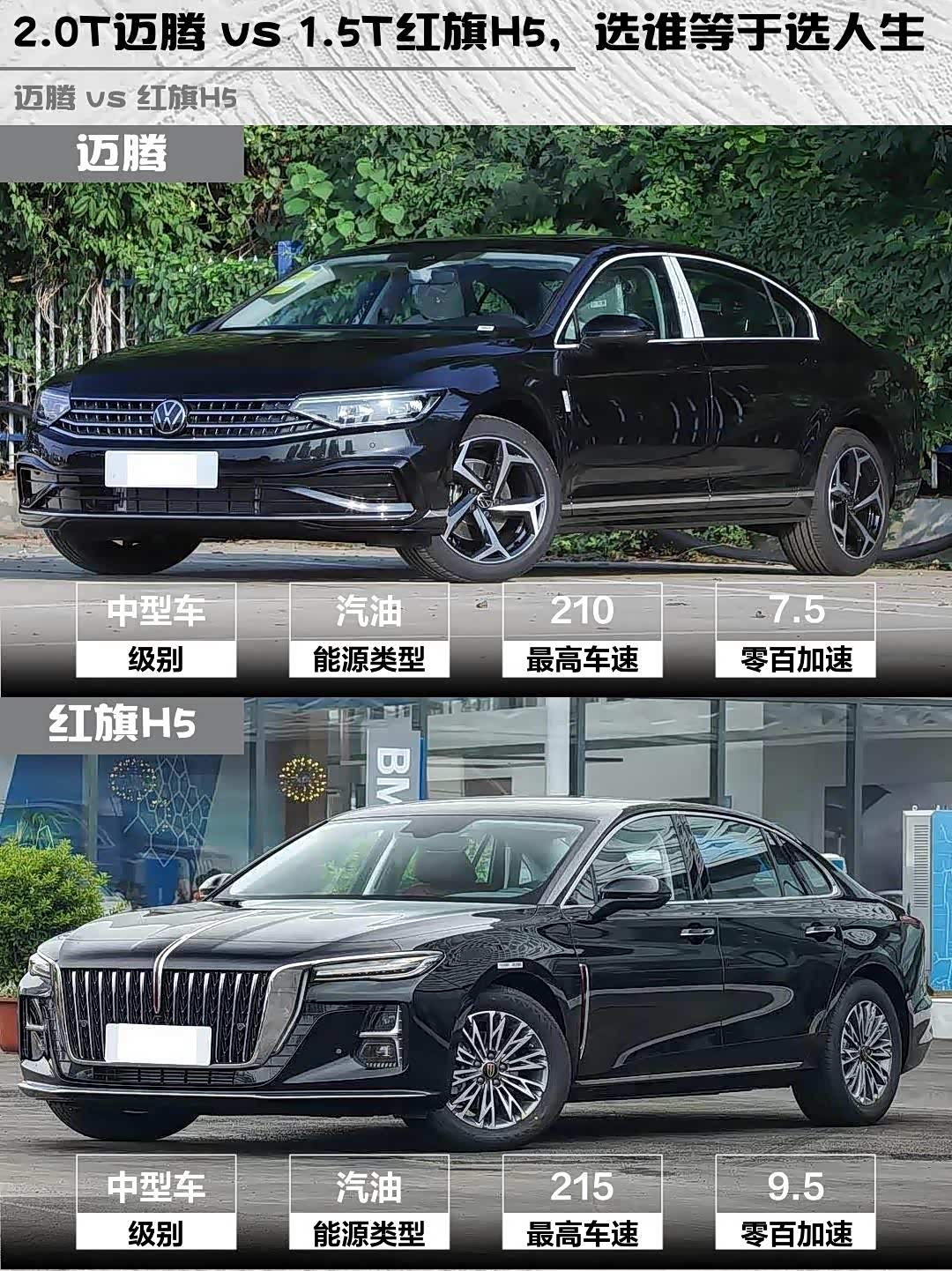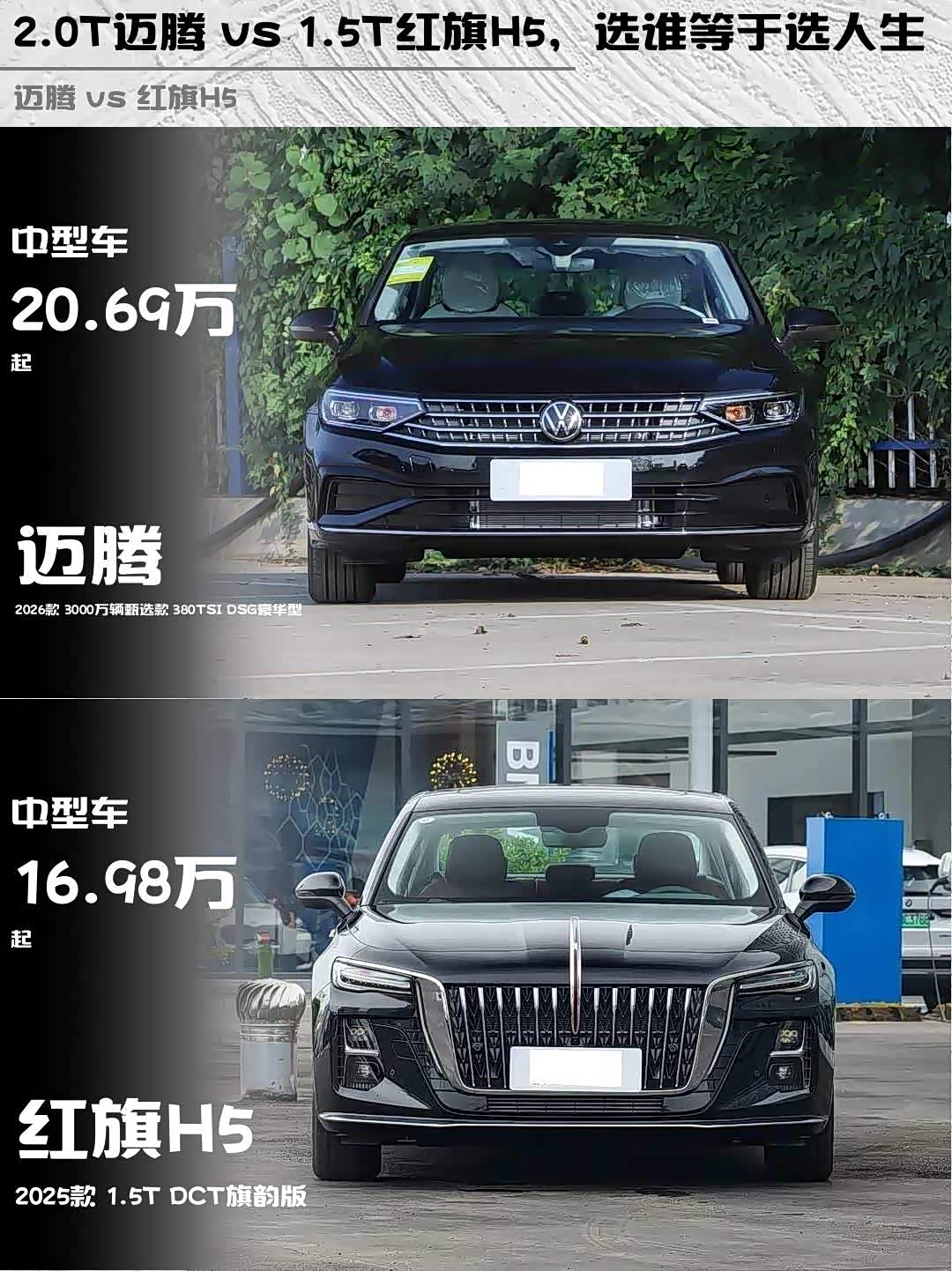 最近在选B级车的小伙伴看过来!今天深度对比两款热门选手——迈腾2026款3000万辆甄选款380TSI DSG豪华型 vs 红旗H5(参数|询价) 2025款1.5T DCT旗韵版,看完这篇就知道哪款更适合你啦!🔥