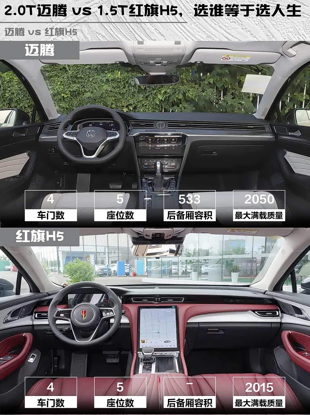 迈腾2871mm轴距的后排堪称"二郎腿专属",533L后备箱能塞下全家露营装备⛺。红旗H5车长4988mm更占优势,后排地台接近纯平,但迈腾的座椅被夸"大沙发级舒适",380版本还有选装通风/加热。不过H5标配全景天窗和丹拿音响(高配),舒适配置更下本。