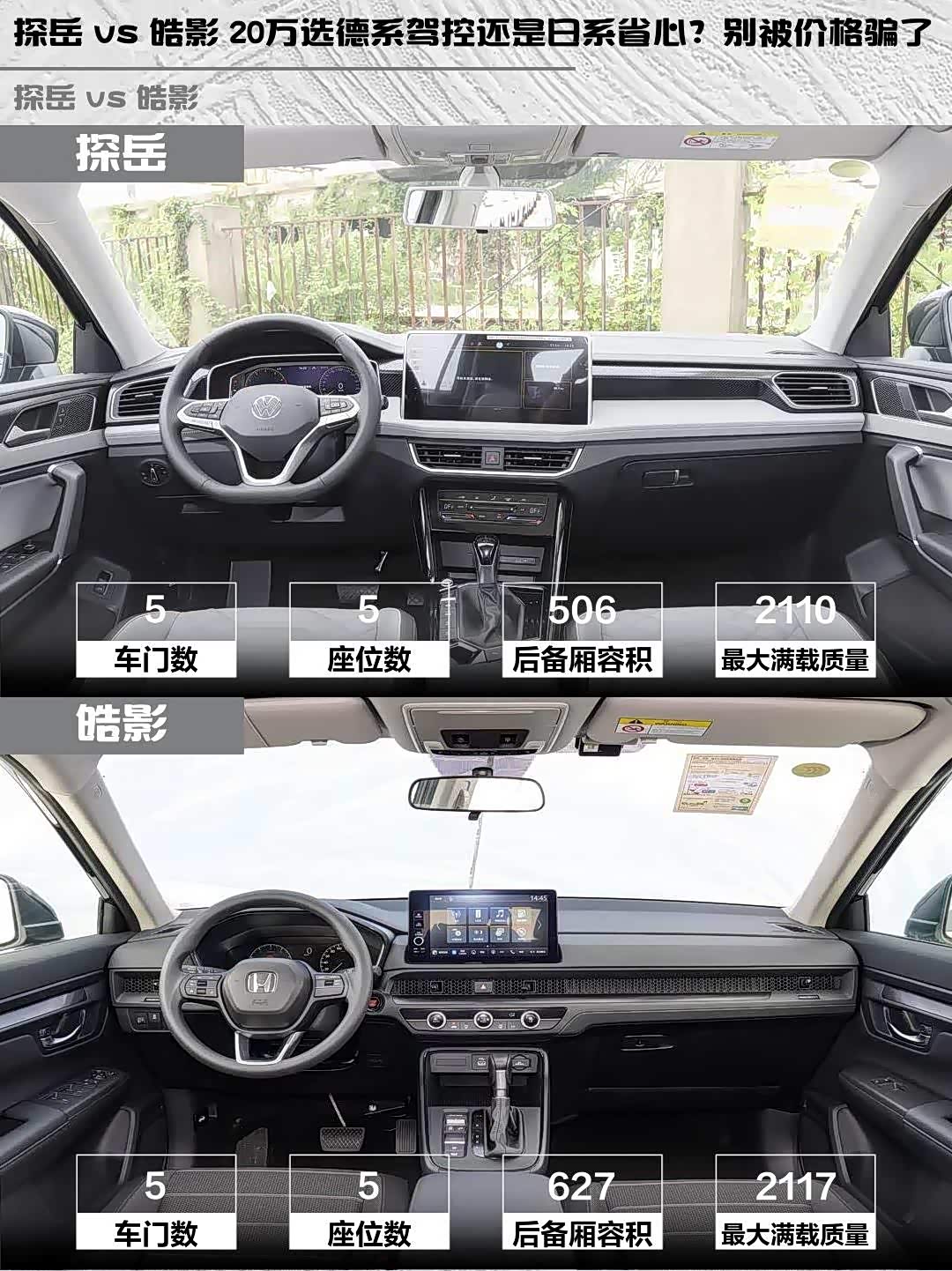 19.89万的探岳标配全速自适应巡航+前方碰撞预警,L2级辅助驾驶得选装;18.59万的皓影只有定速巡航,但多了手机远程控车。中控屏探岳12英寸比皓影10.1英寸更大,不过皓影支持语音控制车窗(探岳没有)。要我说,探岳的配置更实用,皓影则胜在价格优惠大(听说终端能砍5万+)。
