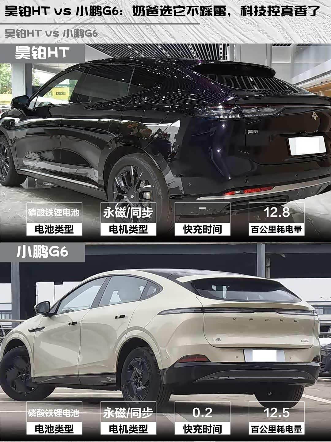 昊铂HT 5.8秒破百的推背感更猛,底盘调校偏舒适适合家用;小鹏G6 6.4秒加速更线性,转向精准适合喜欢操控的。实测昊铂HT悬架过滤坑洼更彻底,小鹏G6过弯支撑性更好,真是鱼与熊掌难兼得啊!